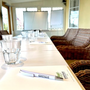 Konferenslokalen är luftig och modern och passar för upp till 18 personer. Utsikten över havet är vederkvickande och stolarna är generösa och sköna. Vi har en skön foajé att hänga i för det lite mer informella mötet.
